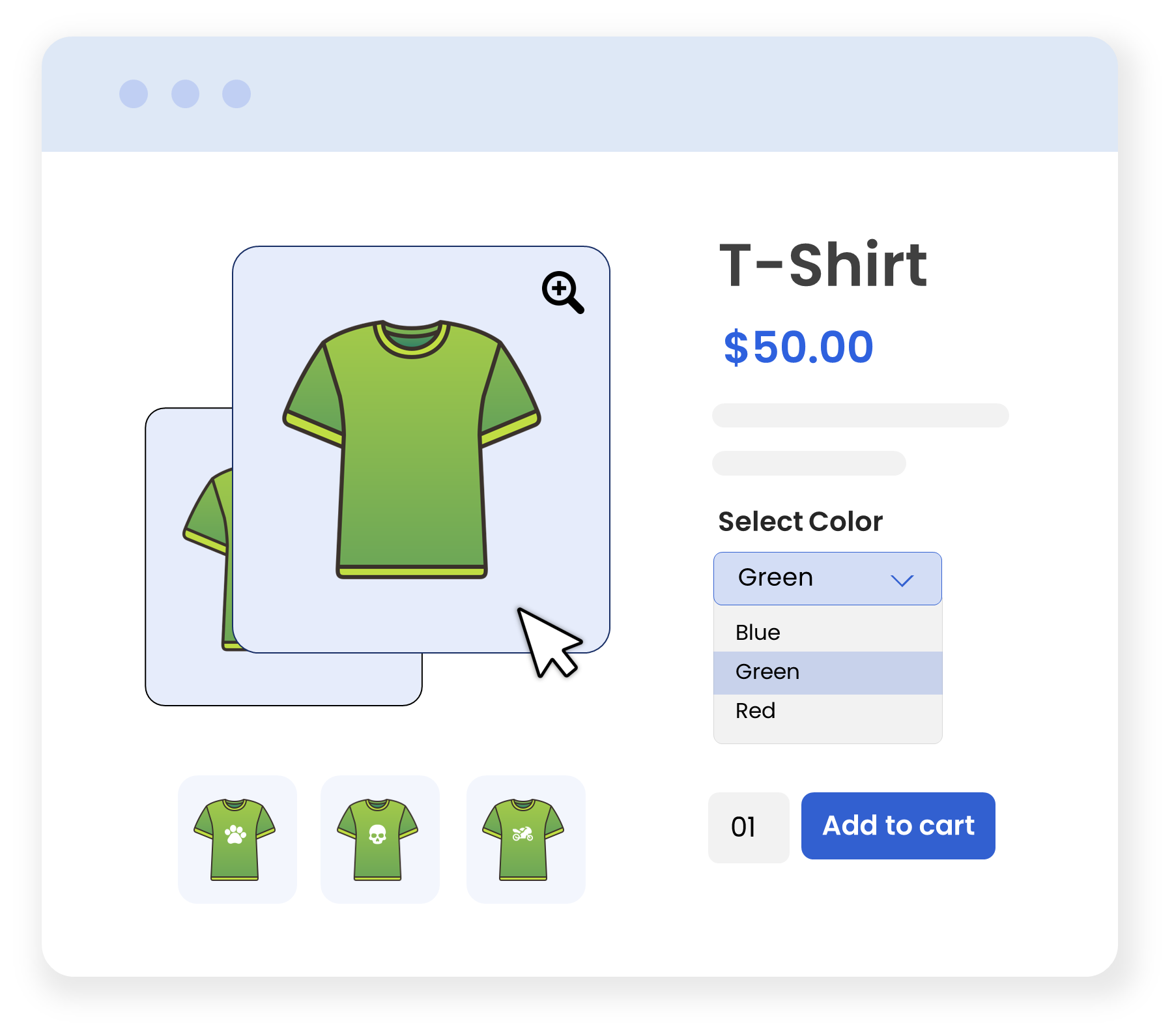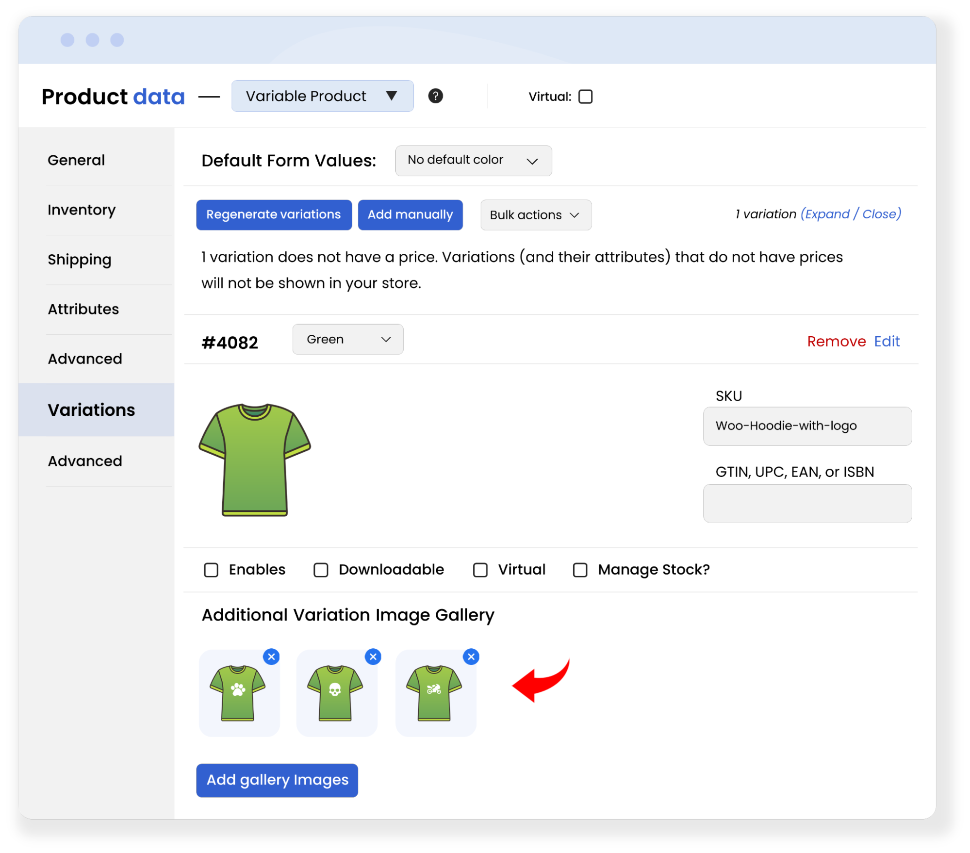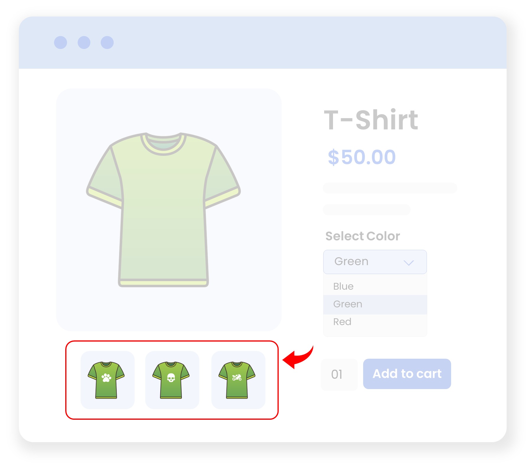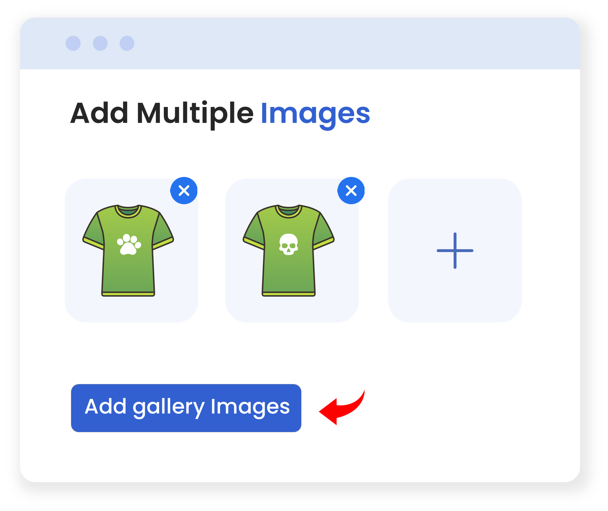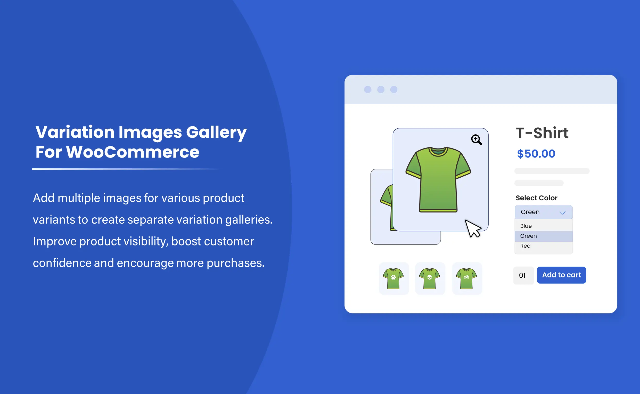 Instead of displaying a single image for each variant in a product gallery, you can take your product marketing to the next level. Create multiple variation image galleries by adding multiple images for each product variant. E.g.,. If you sell a shirt in 3 colors: red, blue, and green, you can add multiple images for each color. The images will help users easily compare your products in different colors and make a quick purchase decision.