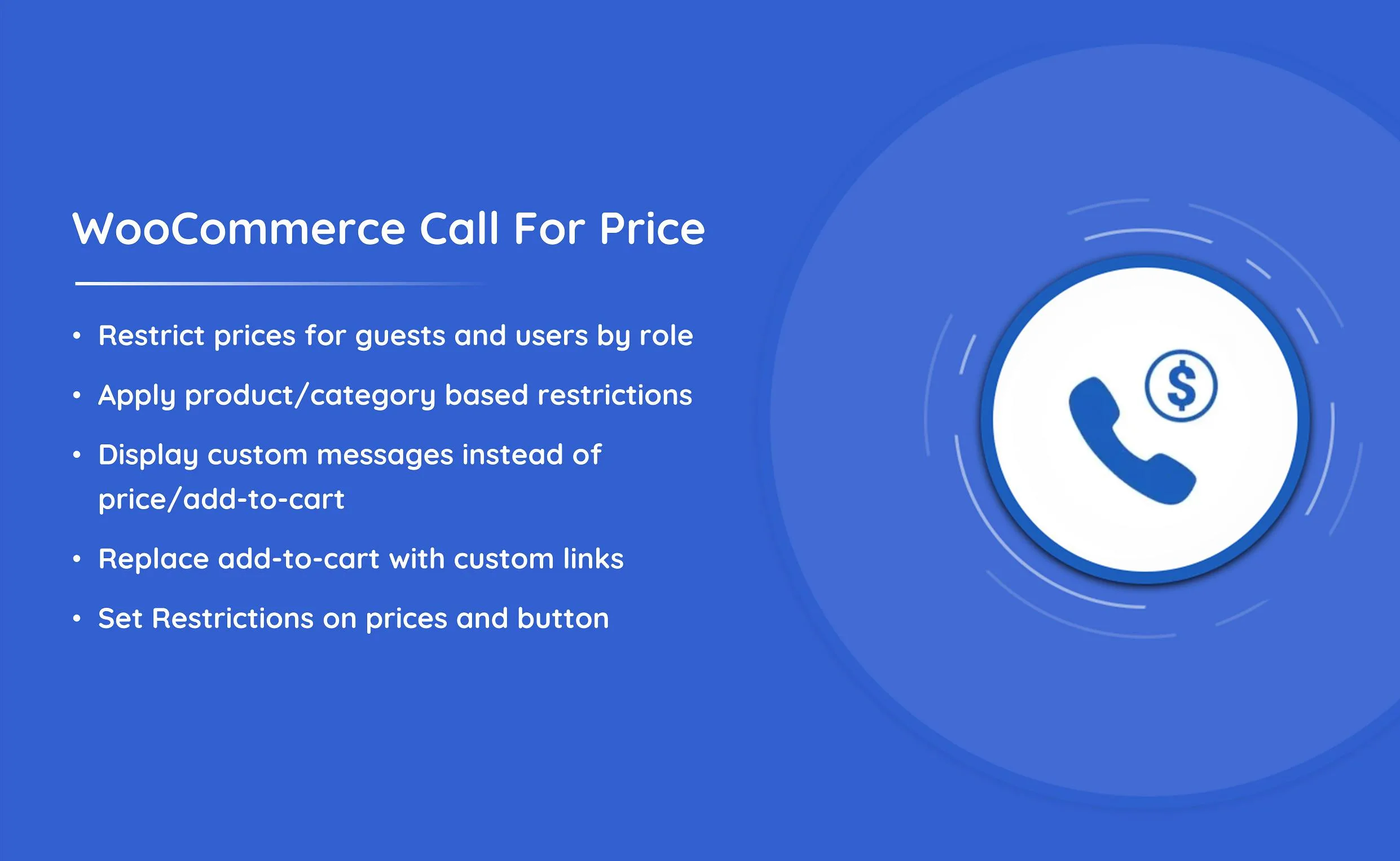 Hide prices and add-to-cart button on your store with the Call for Price for WooCommerce plugin. Encourage users to call for charges by concealing prices from guests or specific registered user roles. You can replace prices and add-to-cart buttons with custom text and links as well. Increase customer interest, raise curiosity, and tackle unfair competition from rivals with Call For Price for WooCommerce.