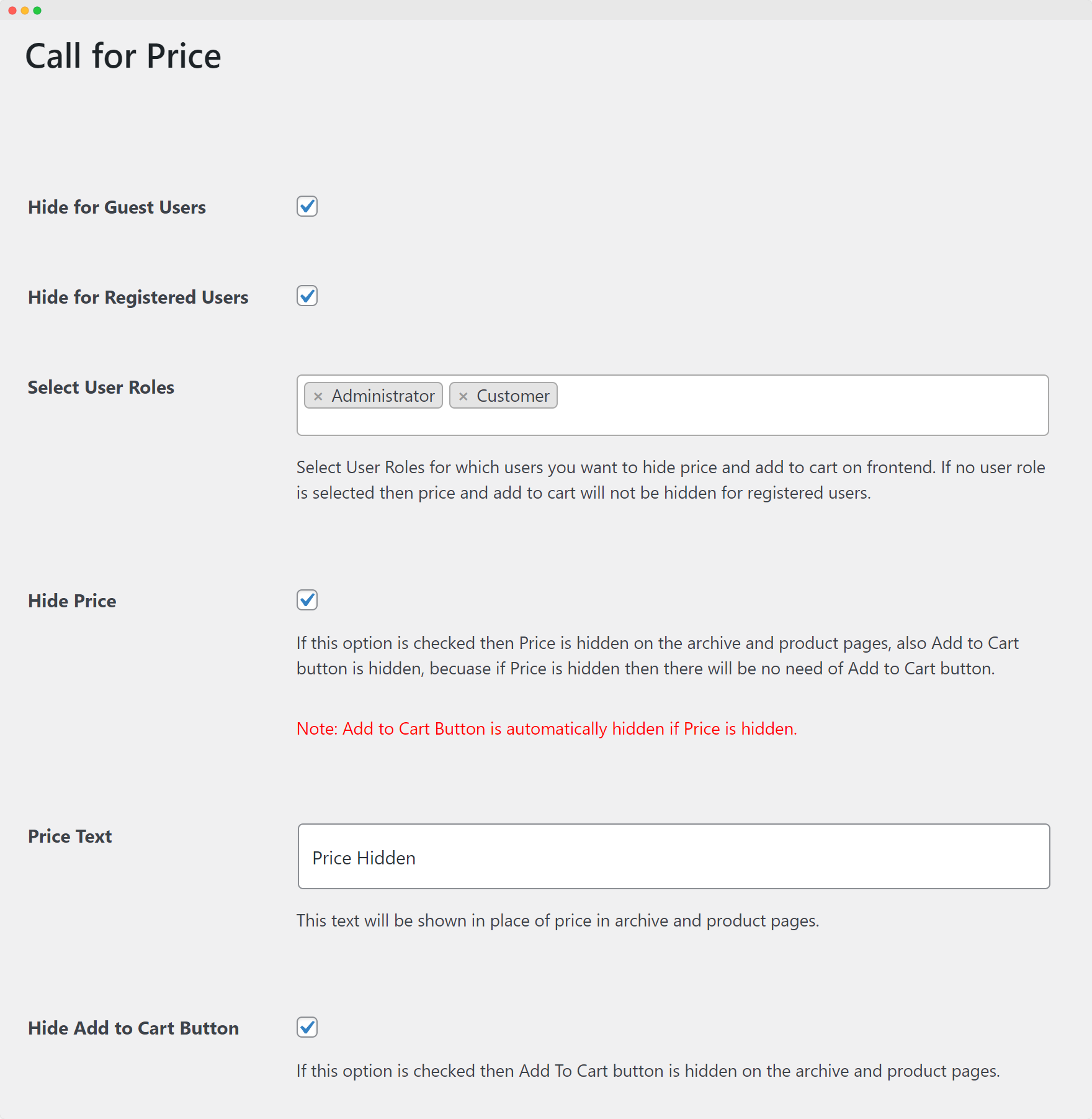 WooCommerce Call For Price allows you to display prices based on user roles. You can choose to show or hide prices and customize what is displayed to which users. You can utilize the following options to set user-based restrictions: