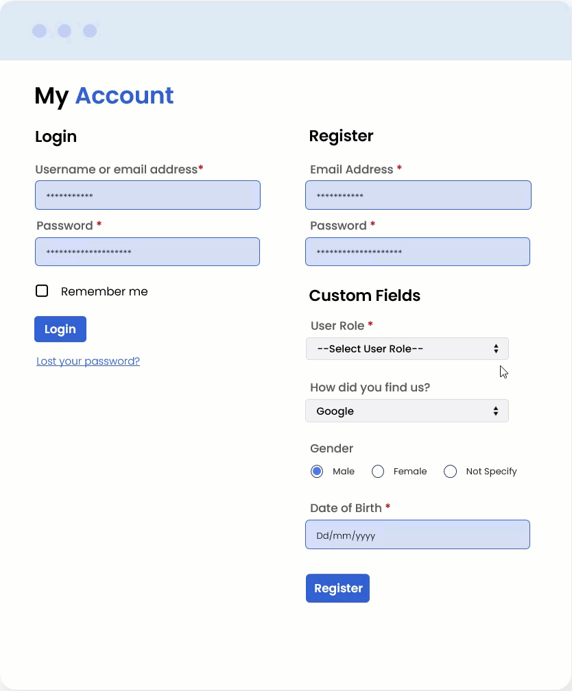Remember: Your new fields will be shown your WooCommerce registration form, if Woocommerce is active; if not, the same fields will be shown on a WordPress registration form.
