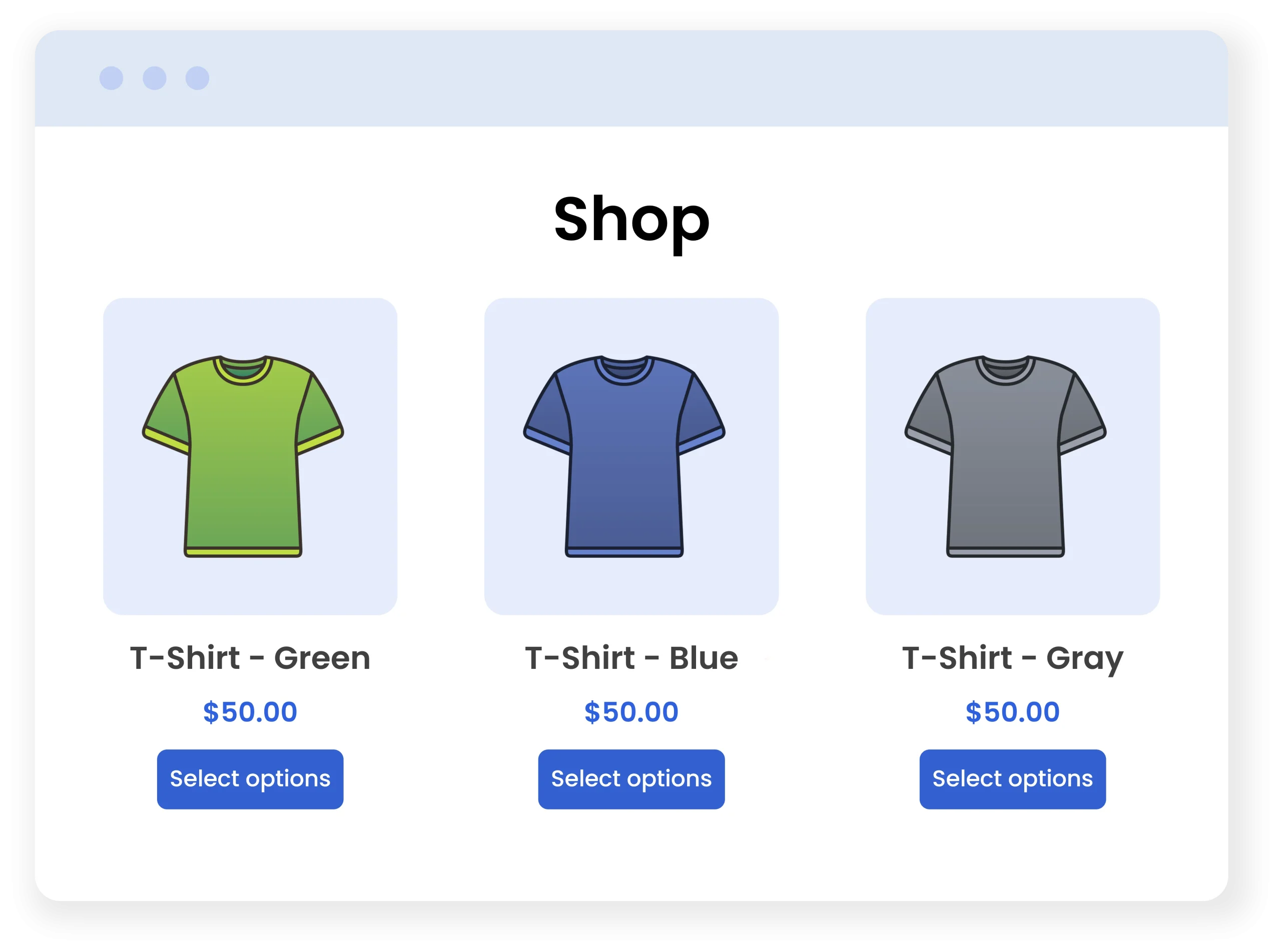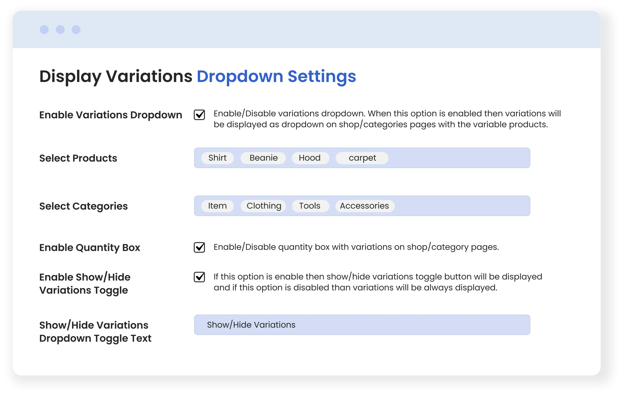 WooCommerce Products by Attributes & Variations Plugin allows its users to display variations on the shop page along with Add to Cart button. This way, customers will be able to select their desired variations from a drop-down menu or toggle mode option. By default woocommerce variations and attributes are not customizable, hence by using this plugin the shopping experience becomes easier and does not require visiting any individual product pages to make selections. The attributes will be displayed in the same pattern as on the product detail page. The key settings available are: