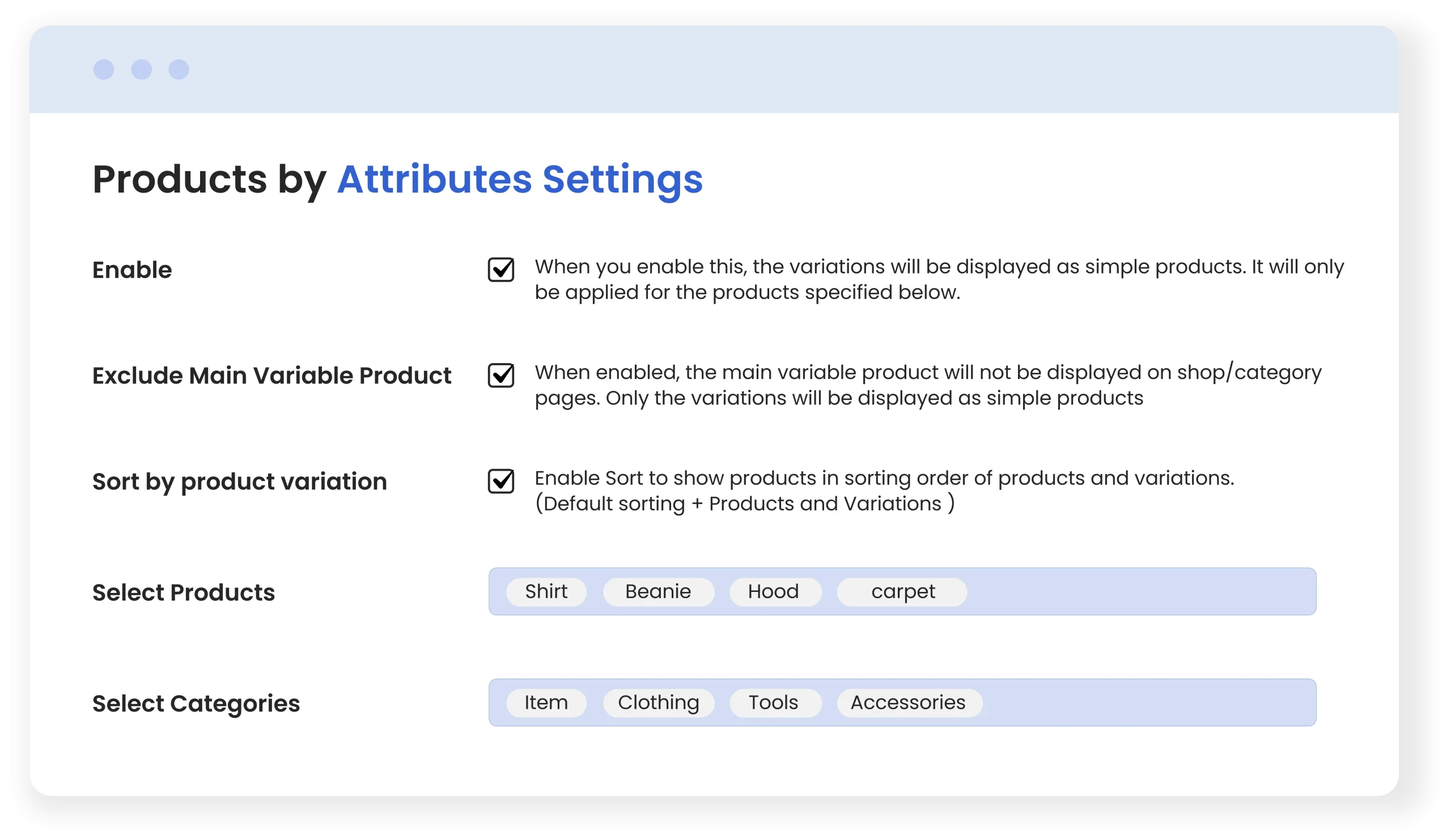 Custom Product Attributes WooCommerce allows users to display product variations for specific products and categories. Various customizations are supported for individual variation products including product title, sorting order, and excluding the entire product, etc. Similarly, customizations are also applicable while displaying product attributes like product quantity, size, and color, etc. Default woocommerce product attributes do not contain such customizability options.