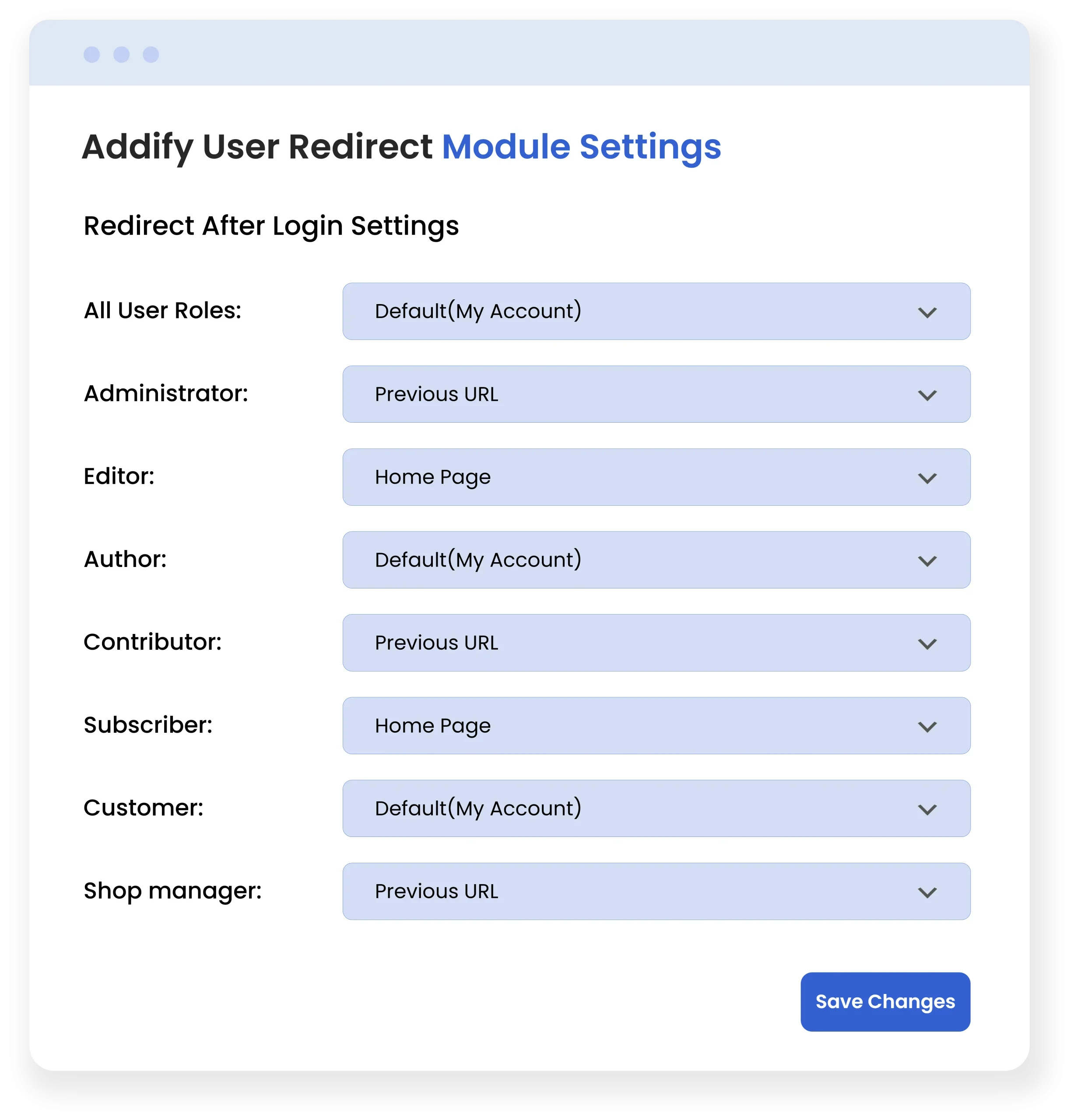 The WooCommerce Redirect After Login, Registration, & Logout Plugin allows you to redirect all or selected user roles to desired web pages. You can set redirect links for each role separately or redirect all users to the same page. For registered, logged-in, and logged-out users, you can set up the following redirections in place: