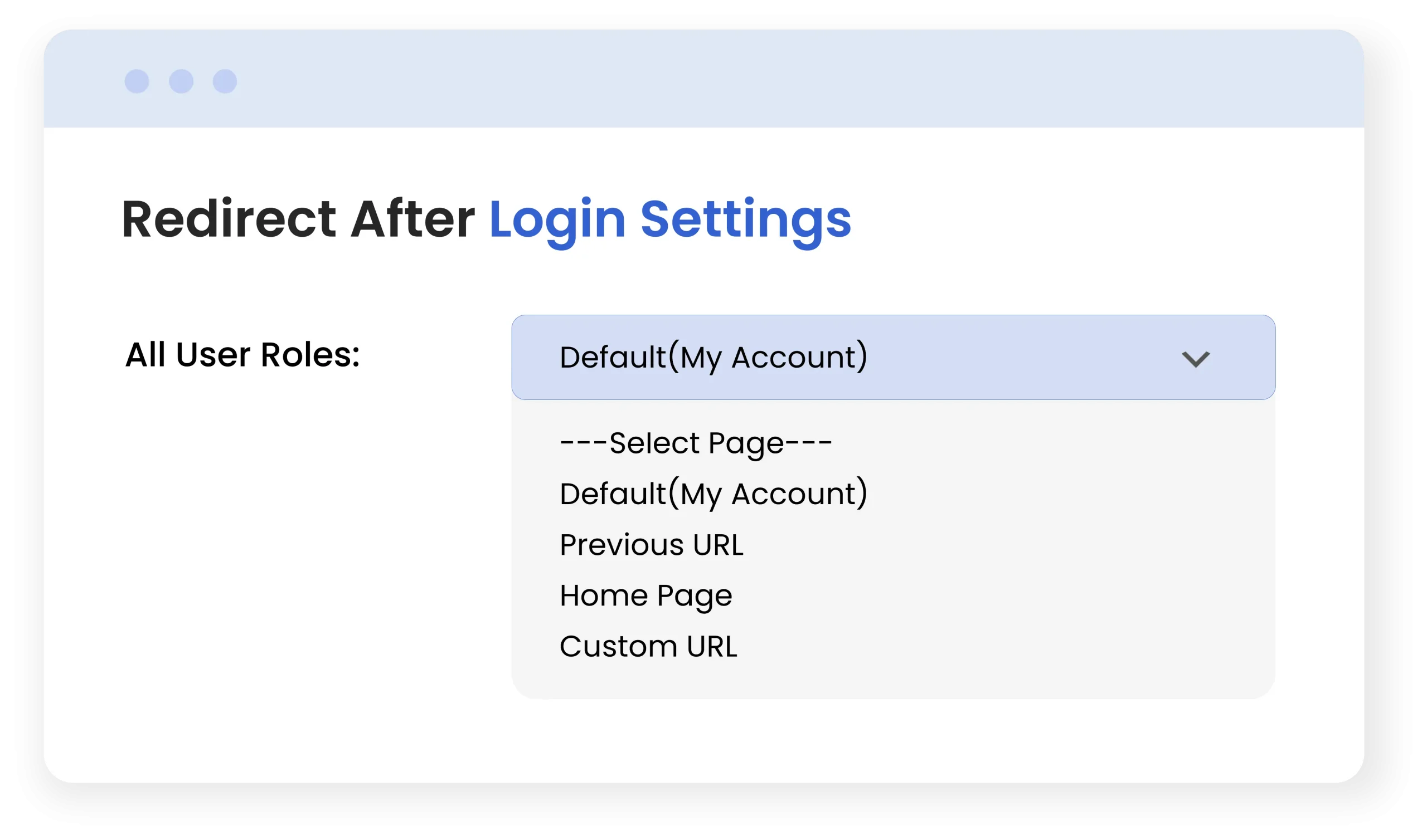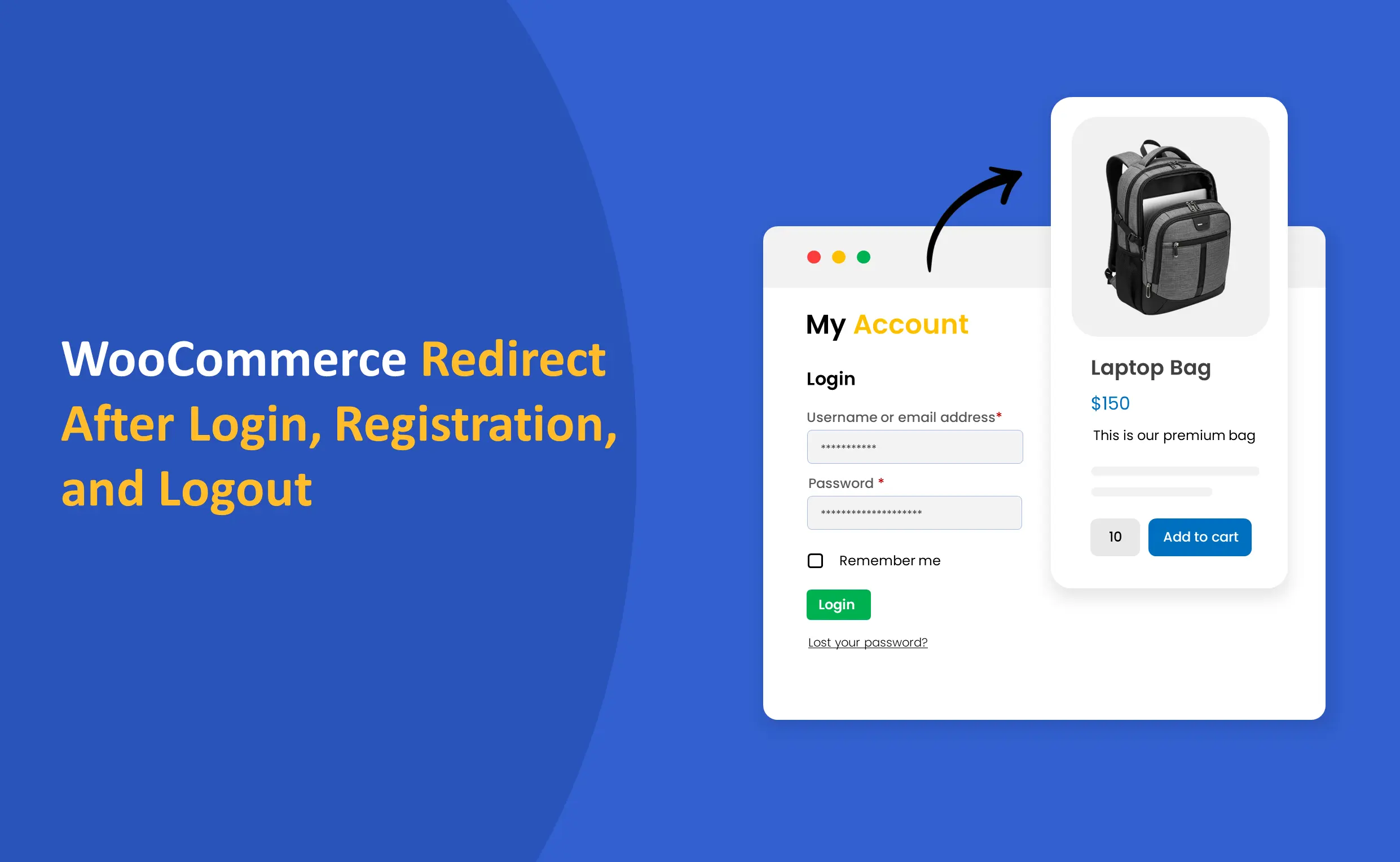 Redirect users to defined webpages Redirect After Login, Registration, and Logout for WooCommerce. Choose to redirect all users to the same web page or choose different pages for each role. You can also set up redirects based on customer action: registered, logged-in, or logged-out.