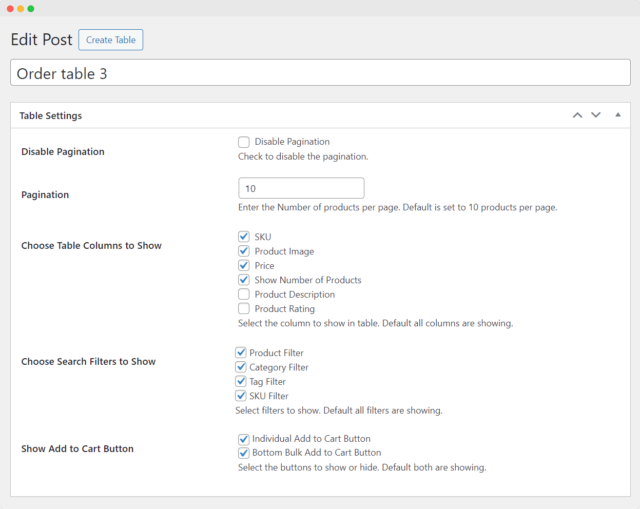 Additionally, the plugin allows you to create specialized order tables based on product and categories. Enable the table for all products or specify products, categories, and tags.